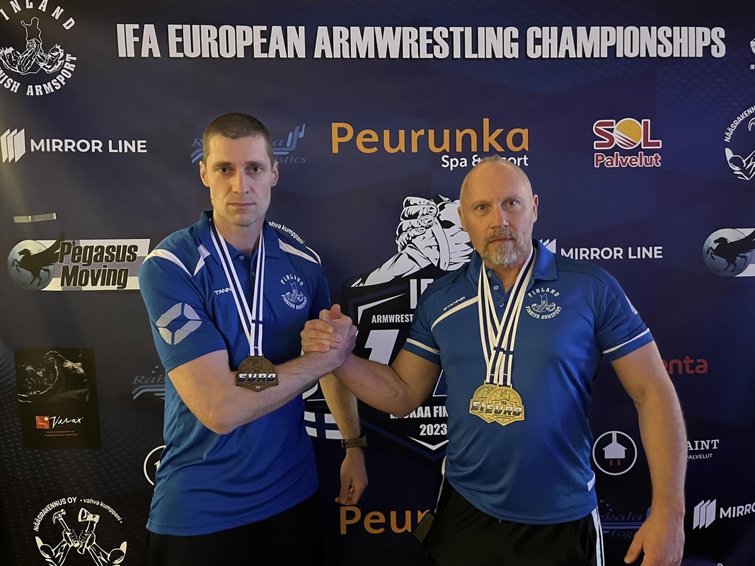 Järvenpään Kädenvääntäjien Marko Karppinen ja Aleksi Olkinuora saavuttivat yhteensä kolme mitalia vuoden 2023 EM-Kilpailuissa. Karppinen voitti kultaa molemmilla käsillä Grand Master -95 kg sarjassa, Olkinuora voitti pronssia oikealla kädellä Master -86 kg sarjassa.